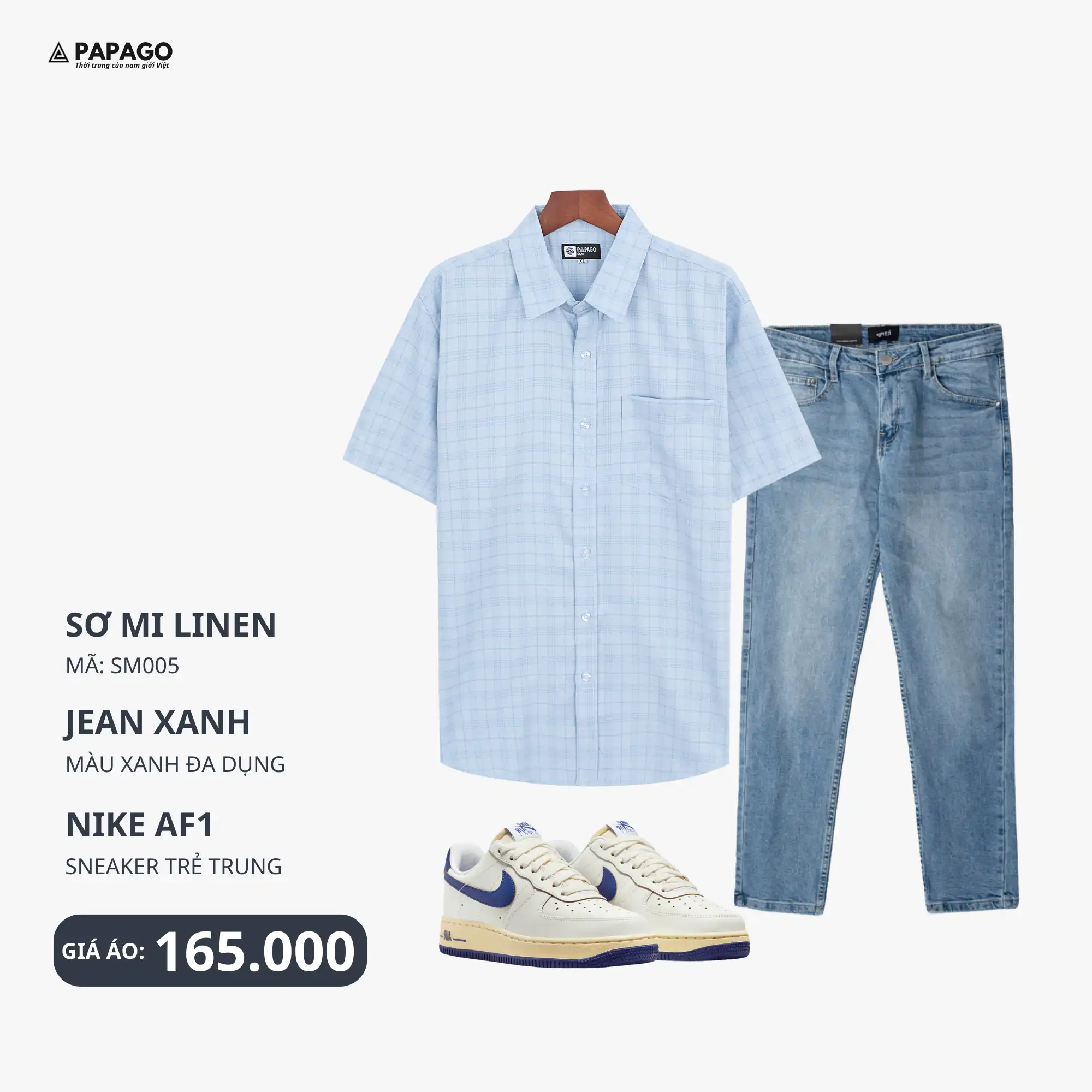 Một trong những cách phối đơn giản nhất là chọn áo sơ mi Papago màu trắng cổ điển, kết hợp với quần jean xanh đậm. Bộ đôi này không bao giờ lỗi thời và dễ dàng ứng dụng trong nhiều tình huống như đi làm, đi cà phê hay dạo phố cuối tuần. Để hoàn thiện tổng thể, hãy chọn giày da lười màu nâu hoặc đen, cùng với một chiếc đồng hồ kim loại hoặc dây da tạo điểm nhấn nam tính.