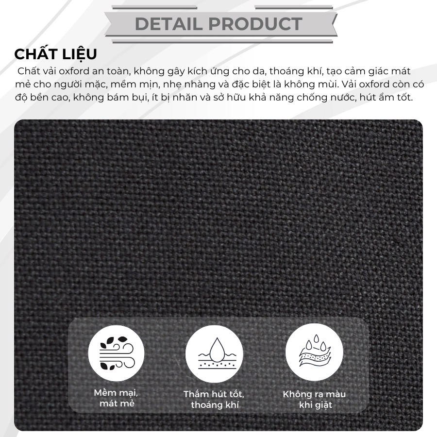 – Chất liệu vải: Chất vải oxford an toàn, không gây kích ứng cho da, thoáng khí, tạo cảm giác mát mẻ cho người mặc, mềm mịn, nhẹ nhàng và đặc biệt là không mùi. Vải oxford còn có độ bền cao, không bám bụi, ít bị nhăn và sở hữu khả năng chống nước, hút ẩm tốt.
