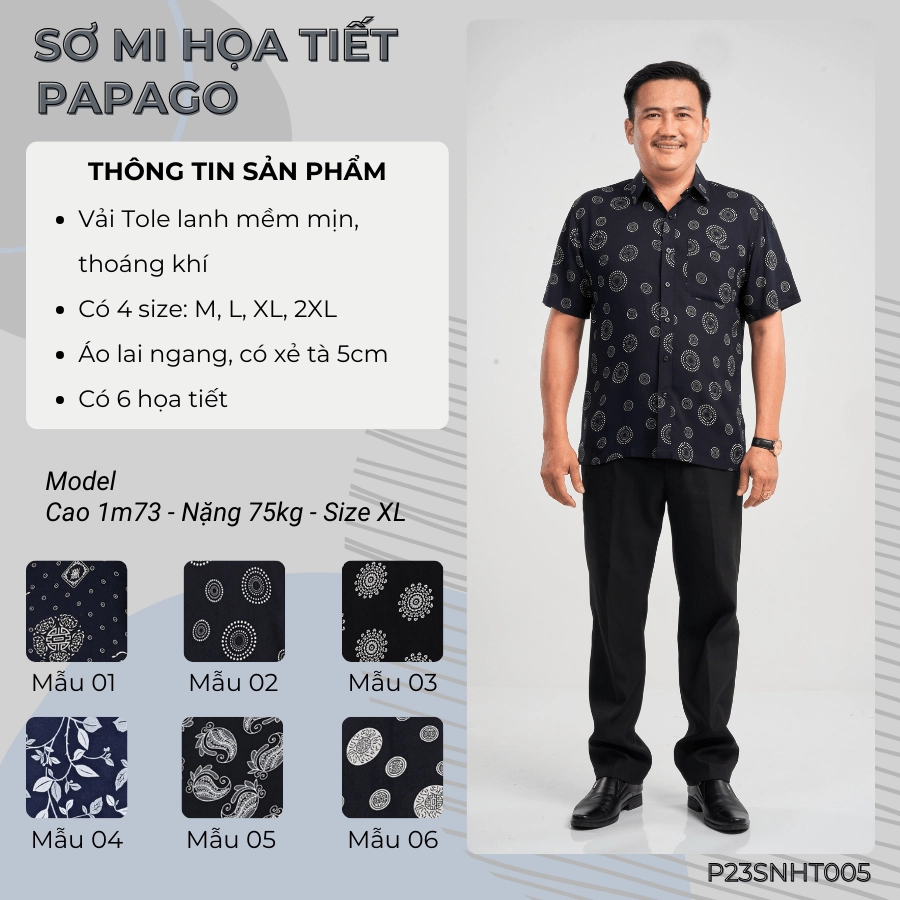 – Tên sản phẩm: Áo sơ mi nam trung niên PAPAGO tay ngắn lai ngang xẻ tà – P23SNHT005