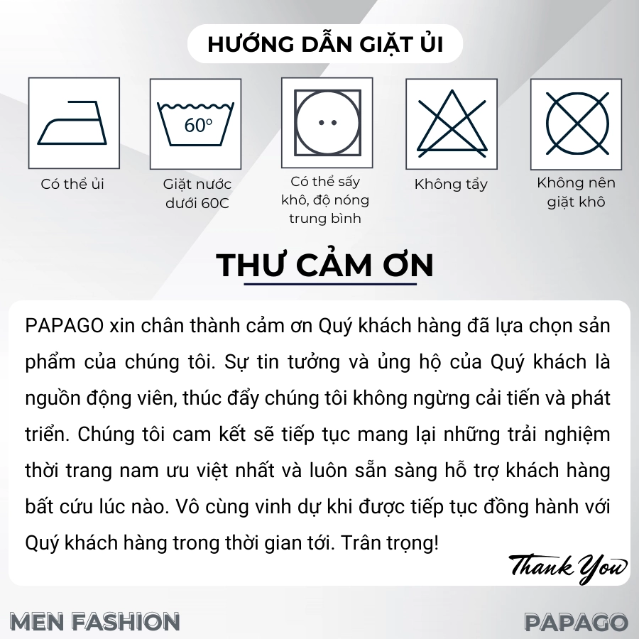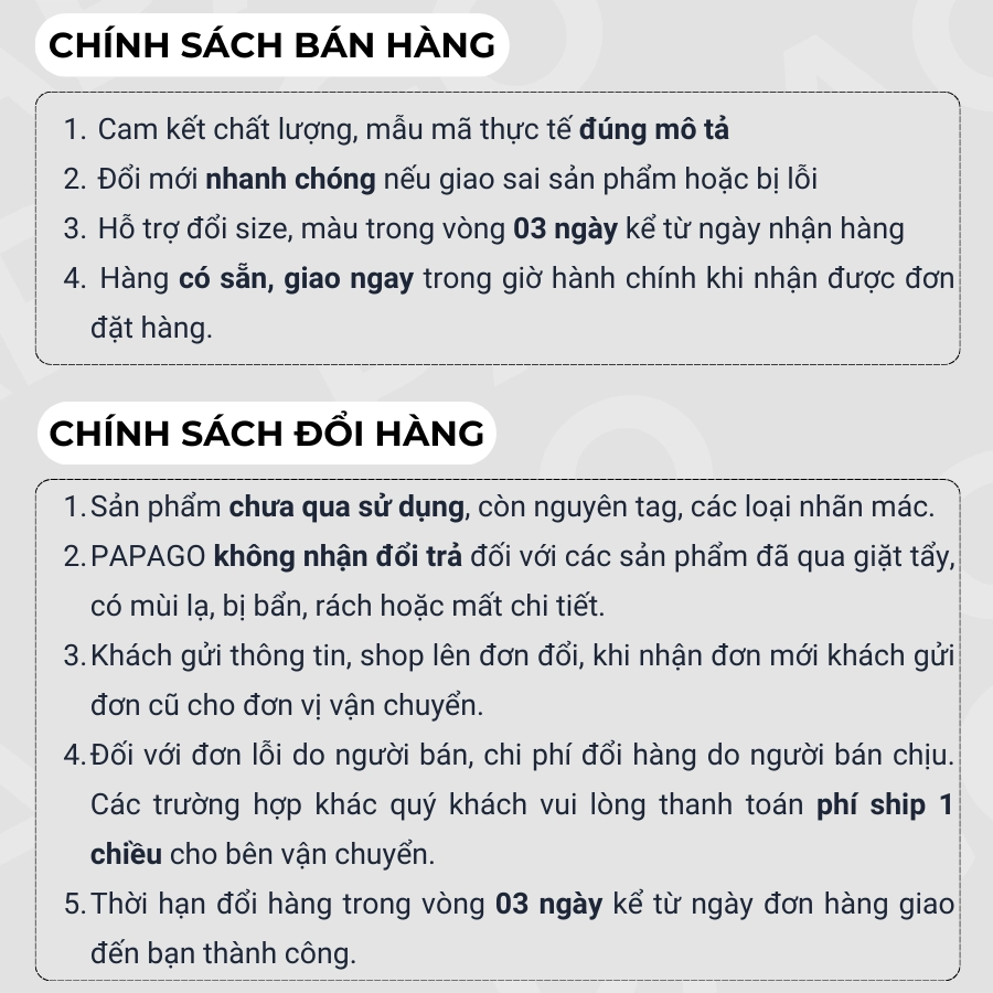 2. PAPAGO không nhận đổi trả đối với các sản phẩm đã qua giặt tẩy, có mùi lạ, bị bẩn, rách hoặc mất chi tiết.