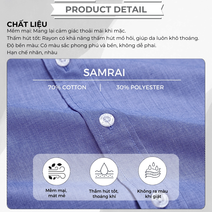 – Chất liệu vải: Vải Samray – Thành phần: 70% cotton 30% Polyester . Vải mềm mịn, thấm hút tốt, vải thoáng mát và chống nhăn