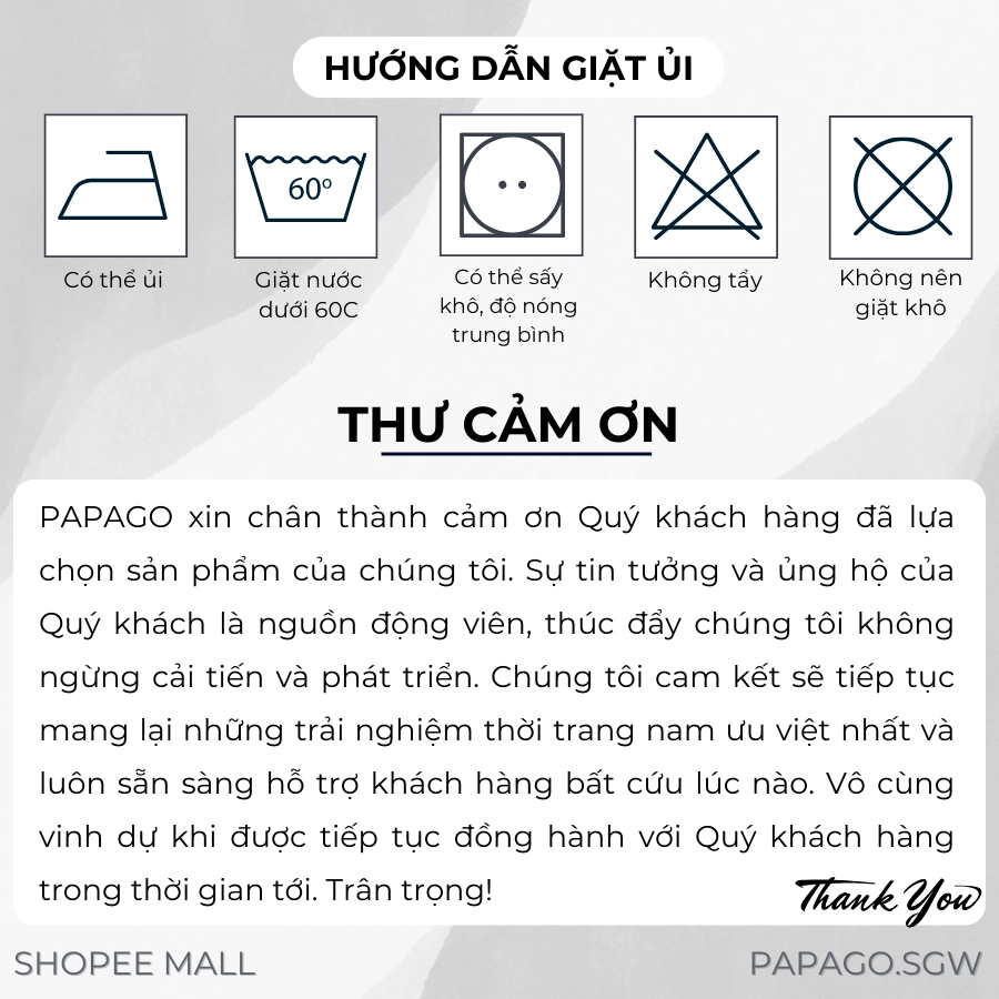 2. PAPAGO không nhận đổi trả đối với các sản phẩm đã qua giặt tẩy, có mùi lạ, bị bẩn, rách hoặc mất chi tiết.